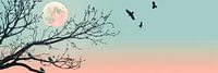 Deze sfeervolle afbeelding van een maan boven een eenzame boomtop vangt de stille en vredige sfeer van de nacht. De zachte kleuren en duidelijke silhouetten van de takken en vogels creëren een gevoel van rust en contemplatie. Perfect voor rustige hoekjes in huis die een ontspannende decoratie nodig hebben.