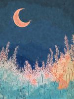 Onder de halvemaan rust dit bloemenveld in een serene gloed. De zachte tinten blauw, roze en oranje geven het werk een verstilde schoonheid, alsof de nacht zelf ademt. Dit werk vangt de magie van een middernachtelijk landschap, waarin elke bloem en elk blad onder de maan lijkt te stralen.