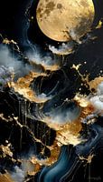 Rechts op de foto verschijnt een gouden cirkel in volle vorm - een stille, glanzende maan die in haar perfectie boven het landschap lijkt te zweven. Zonder begeleidende planeten blijft hij alleen staan, alsof hij stilletjes over het tafereel waakt. De diepzwarte achtergrond opent de ruimte in het oneindige en verleent de foto een contemplatieve diepte die doet denken aan het universum, het onzichtbare en het onbegrijpelijke.