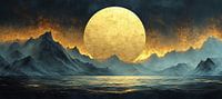 Maanlandschap | Nachtelijk Berglandschap Reflectie - Dit landschapsschilderij toont een dramatische scène met ruige, donkere bergtoppen onder een immense, stralende gouden maan, weerspiegeld in het subtiele wateroppervlak, wat een mystieke en serene sfeer creëert.