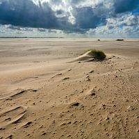 Mystieke sferen op het uitgestrekte strand de Hors op Texel. Een maanlandschap in het gele zand, afstekend tegen een dramatische wolkenlucht waardoor de zon lange schaduwen werpt.