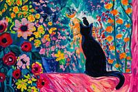 'Maanlicht Miauw' is een speels en kleurrijk kunstwerk waarin een nieuwsgierige zwarte kat het tafereel steelt. Omgeven door een overvloed aan wilde bloemen in felle kleuren, kijkt het silhouet van de kat naar een mystieke, glimlachende maan. Dit levendige schilderij vertelt het verhaal van een magische nacht waarin de wereld tot leven komt met betoverende kleuren en vormen. Het roept de verwondering op die we als kind voelden bij het verkennen van onze eigen achtertuin bij schemering. De intense, rijke kleuren creëren een warme en boeiende atmosfeer, en brengen energie en fantasie in elke ruimte. Perfect voor dierenliefhebbers en dagdromers, zal dit stuk een bron van vreugde en inspiratie zijn aan elke muur waar het schittert.