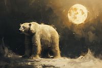 Dit sfeervolle kunstwerk toont een majestueuze ijsbeer, badend in het zachte schijnsel van de volle maan. De gouden en donkere tinten creëren een dramatische en mysterieuze sfeer, terwijl de texturen de ijzige wereld van de Arctische wildernis tot leven brengen. Het krachtige silhouet van de beer straalt rust en autoriteit uit, perfect weergegeven in deze artistieke interpretatie. Ideaal voor liefhebbers van wilde dieren en betoverende nachtlandschappen, dit werk voegt een gevoel van mystiek en kracht toe aan elk interieur.