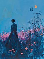 Maanlicht Schilderij - Dit vrouwen schilderij toont een elegante vrouwelijke figuur vanaf de rug gezien, staande in een weelderig, abstract landschap bij maanlicht, waarbij de bloemen en een uitgesproken maan opvallen in een dominant blauw en roze kleurenpalet.