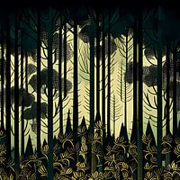 Deze prachtige vectorillustratie toont een mysterieus nachtelijk bos met donkergroene bladeren die worden verlicht door zacht maanlicht. De compositie is geïnspireerd op Art Deco-design en bestaat uit elegante, gestileerde bomen met strakke lijnen, geometrische elementen en een contrastrijke houtsnijkunst. Gouden details glinsteren tegen een diepzwarte achtergrond, waardoor een opvallend maar gedempt kleurenpalet ontstaat. Het samenspel van schaduw en silhouetverlichting voegt diepte en intrige toe aan de afbeelding, waardoor deze perfect is voor liefhebbers van verfijnde, op de natuur geïnspireerde kunstwerken met een tijdloze esthetiek.