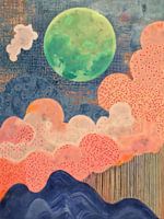 Onder een helder verlichte groene maan zweven roze wolken zachtjes over de toppen van donkere bergen. De patronen in de lucht en het contrast tussen de koele en warme tinten zorgen voor een magische sfeer. Dit werk lijkt een fantasiewereld te vangen waar de maan en wolken samensmelten tot een dromerig landschap vol kleur en textuur.