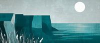 Een harmonieus samenspel van zachte blauwe en grijze tinten voert de kijker mee naar een rustig kustlandschap. De gestileerde kliffen en het glinsterende water stralen sereniteit uit, terwijl de grote maan een mystieke sfeer creëert. Ideaal voor in de woonkamer om ontspanning en natuurlijke schoonheid in huis te brengen.