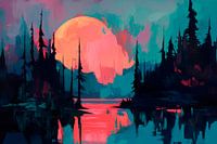 De samensmelting van felroze en diepblauw vormt een dromerig boslandschap waarin de grote, mystieke maan zachtjes boven het stille water staat. De reflecterende golven en glinsterende boomsilhouetten creëren een vredige sfeer die perfect is voor een slaapkamer om een vleugje rust en magie toe te voegen.