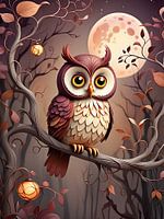 In dit kunstwerk wordt een uil afgebeeld die op een tak zit onder een volle maan. De scene is geïnspireerd door een combinatie van Jugendstil en Art Nouveau, wat terug te zien is in de sierlijke, kronkelende lijnen van de takken en de zachte, vloeiende vormen van de bladeren. De uil zelf is gedetailleerd uitgewerkt, met grote,…