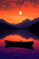 Een magische zonsondergang transformeert de lucht in een vurig schilderij van oranje en paars, terwijl het kalme meer de schoonheid van het berglandschap weerspiegelt. Het silhouet van een eenzame kano voegt een gevoel van rust en eenzaamheid toe. Ideaal voor de woonkamer om een ontspannen sfeer te creëren en dromen te doen ontwaken.