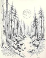 Dit is een zwart-wit inkttekening van een serene bosscène, weergegeven in een gedetailleerde, illustratieve stijl die doet denken aan klassieke pen- en inktillustraties. Het perspectief trekt de kijker's blik langs een zacht, meanderend beekje, aan weerszijden geflankeerd door een dicht struikgewas van hoge, slanke bomen.
