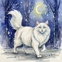 Een mooie witte kat zwerft door een mystiek bos onder een maansikkel. De nachtelijke hemel is bezaaid met sterren en creëert een vredige sfeer.