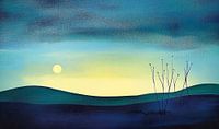 Een minimalistisch landschap toont glooiende heuvels onder een lucht met een kleurverloop dat verandert van helder geel naar diepblauw, met een kleine maan aan de horizon. Schaarse, tere takken rijzen op in de voorgrond en vormen een contrast met de kalme achtergrond.