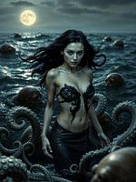 Dit fascinerende kunstwerk toont een mysterieuze sirene die zich in de donkere golven van de oceaan bevindt, verlicht door het zachte, koele licht van een volle maan. Haar hypnotiserende blik, omlijst door lange, wapperende haren, roept een gevoel van mysterie en onweerstaanbare aantrekkingskracht op. Om haar heen kronkelen tentakels die uit de diepte lijken te komen, wat een spannend en enigszins sinistere sfeer toevoegt aan het tafereel. De donkere tinten van de nachtelijke zee contrasteren prachtig met de delicate details van haar sierlijke kleding en de glinstering van het maanlicht op het wateroppervlak.