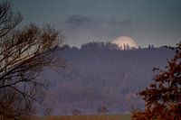De volle maan verdwijnt in de vroege ochtend achter de Dörnberg in Noord-Hessen.