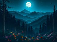 Badend in de etherische gloed van een volle maan ontvouwt zich een verstild berglandschap. In de verte rijzen silhouetten van bergtoppen op, hun vormen verzacht door lagen atmosferisch perspectief, waardoor een gevoel van diepte en mysterie ontstaat. Dichterbij de kijker staat een donker woud van altijdgroene bomen, hun puntige vormen in contrast met de zachte rondingen van de heuvels. Een levendig tapijt van wilde bloemen in roze, gele, oranje en witte tinten bezaaid de voorgrond, het toevoegen van een vleugje aardse schoonheid aan de nachtelijke scène. De hemel, diep indigo, wordt onderbroken door de schitterende maan en een aantal verre sterren, die een gevoel van vredige eenzaamheid en de stille grootsheid van de natuur onder de nachtelijke hemel oproepen.