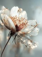 Een delicate witte bloem met gouden stuifmeel glinstert zacht in etherisch licht en creëert een dromerige, bijna magische sfeer