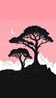 Dit opvallende silhouet kunstwerk vangt een serene nachtscène. Twee majestueuze, donkere bomen staan prominent tegen een zachtroze hemel verlicht door een maansikkel. Grillige, besneeuwde bergen vormen een verre, contrasterende achtergrond en voegen diepte en een gevoel van wilde schoonheid toe aan de compositie. De donkere voorgrond…