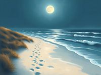 Een sereen schilderij met de rustgevende schoonheid van een strand bij nacht onder volle maan, met zachte golven en voetafdrukken die een pad in het zand volgen.