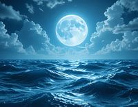 Een betoverend digitaal kunstwerk met een lichtgevende volle maan die haar etherische gloed werpt op een uitgestrekte, golvende oceaan. De maan, weergegeven in een zachte, koele blauwe tint, domineert de scène, zijn licht weerkaatst op de rollende golven eronder. Slierterige wolken drijven langs de nachtelijke hemel en voegen diepte en…
