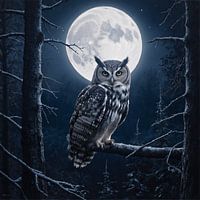 Een indrukwekkende uil zit kalm op een tak onder de gloed van een volle maan. De scherpe blik van de uil en het mystieke licht van de maan creëren een magische sfeer, die de mystiek en wijsheid van de nacht symboliseert.