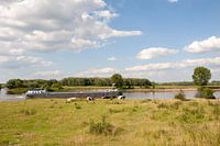 Den Bosch Noord Brabant The Netherlands Cows graze the banks of the River Maas as cargo ships sail past. Gelderland on the opposite bank.