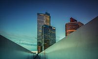 Zicht op de maastoren in Rotterdam bij avond vanaf een loopbrug.