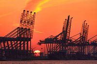 Zonsondergang achter de containerkranen op de Delta Terminal. Deze ECT terminal bevindt zich op Maasvlakte 1. De foto werd vanaf een schip in de Europahaven genomen.