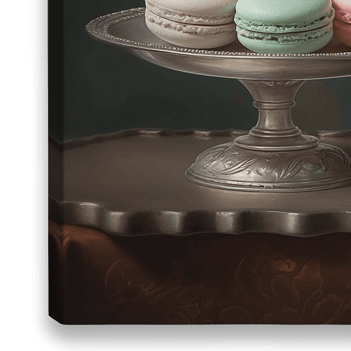 Een verfijnde foto van een stapel macarons op een glimmende, zilveren schaal. De macarons, in zachte pasteltinten zoals wit, roze, geel, groen en pistache, liggen delicaat gerangschikt en nodigen de kijker uit om te genieten van hun perfectie. De zilveren schaal en de subtiele, donkere achtergrond zorgen voor een klassieke en luxueuze…