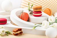Deze foto toont een artistieke compositie van kleurrijke macarons en delicate witte bloemen, geplaatst op witte geometrische vormen. De macarons zijn in verschillende tinten rood en oranje, en sommige zijn gestapeld op elkaar. De witte bloemen voegen een vleugje elegantie en frisheid toe aan de scène. De achtergrond bestaat uit een…
