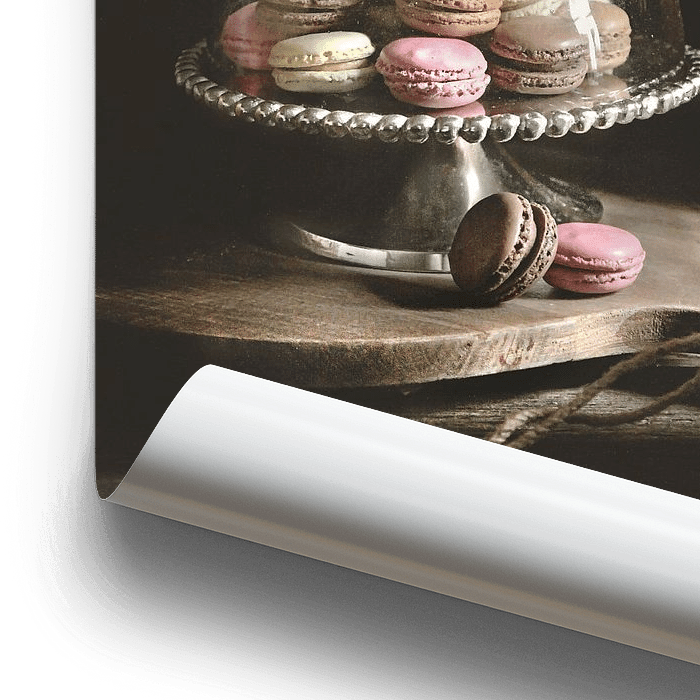 Macarons gefotografeerd in low-key bij natuurlijk licht. Door gebruik van oude materialen ontstaat een exclusieve afbeelding met vintage uitstraling. Prachtig in de keuken!