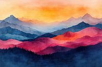 Macedonië Abstract Landschap | Whispering Colors at Dusk - Dit Macedonisch abstract landschap schilderij toont een rijke samensmelting van kleurrijke bergen die elkaar in lagen opvolgen, waarbij de kleuren van zonsopgang of zonsondergang fel contrasteren met de serene tinten van de bergen zelf, wat een gevoel van diepte en rust uitstraalt.