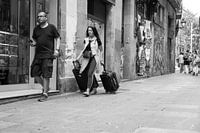 Hij laat haar de koffers trekken en loopt comfortabel vooruit.