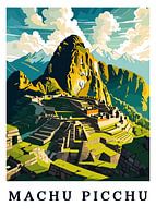 Scherp en helder artwork dat de oude ruïnes van Machu Picchu laat zien te midden van weelderig groen en een bergachtige omgeving in de Andes.