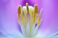 Een macro foto van het hart en de stampers van een tulp.