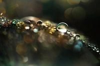 Een macro foto van dauw druppels op een bloem blad.