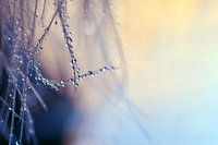 Een macro foto van een veer met water druppels.