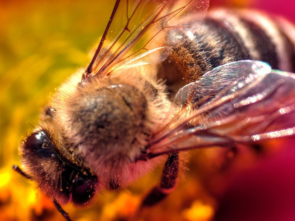 Close-up van een nectarzoekende bij op een cosmeabloem