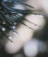 De schoonheid van de natuur komt tot leven in deze macrofoto van druppels die schitteren op de dennennaalden in het bos. Elke naald is bedekt met glinsterende dauwdruppels, als kleine juweeltjes die de tere schoonheid van de natuur benadrukken.