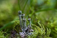 Macro foto van kopjes-bekermos (cladonia) in de herfst. Deze kopjes zijn normaal gesproken ongeer 1 tot 2 cm groot en je zult goed moeten kijken om ze te zien op de grond. Je vindt deze in het bos en op plaatsen waar veel mos is.