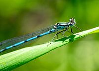 Macro-opname van een blauwe libel op een groen blad