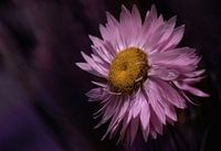 Macrofoto van roze gedroogde bloem op paarse achtergrond. De bloem is volledig in focus, waardoor de roze bloem met gele kern nog er nog extra uitspringt.