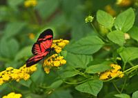 Close-up van een postbodevlinder (Heliconius melpomene) op gele bloem
