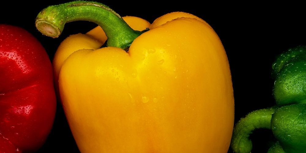Macro verse paprika's met waterdruppels in kleuren rood geel groen tegen zwarte achtergrond