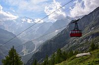 De Passo Moro-kabelbaan boven het hoogste gedeelte van de Valle Anzasca in de Italiaanse Alpen, met de machtige vierduizenders van het Monte Rosa-massief op de achtergrond.