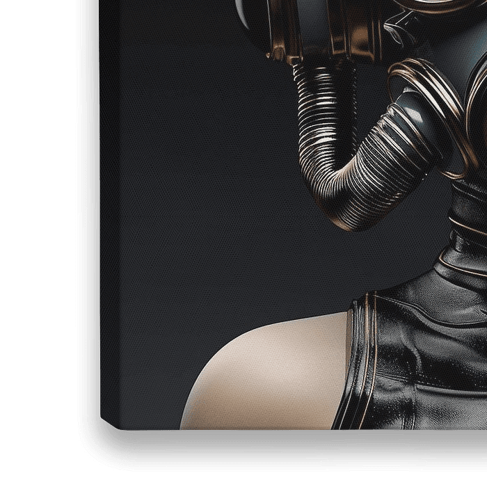 Het portret onthult een vrouw gekleed in een lederen tanktop, haar aura doordrongen van een futuristische uitstraling, haar gezicht deels verborgen achter een opvallend blauw/groen zuurstofmasker.