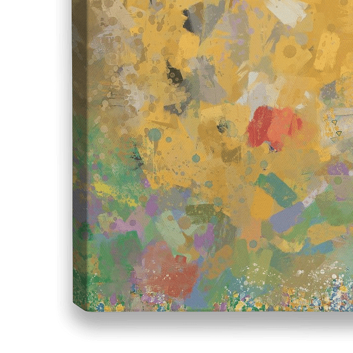 Met dit digitale kunstwerk, wordt de kleur en de basis compositie van het origineel behouden, maar is de uitwerking abstract en expressionistisch van aard. Met losse penseelstreken en spetters krijgen de gestalten vorm. Het hoofdaccent ligt nu echt bij de kus, de innige omhelzin van de twee personen in het centrum van het schilderij. Doordat het schilderij een heel stuk smaller is dan het origineel krijgt het schilderij een heel eigen uiterlijk. Ontzettend mooi voor bijvoorbeeld in een trappenhal of op een kleine, smalle tussenmuur.