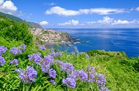 Lelie van de Nijl bloemoen voor een uitzicht over het kustdorpje Seixal op het eiland Madeira tijdens een mooie zomerdag aan de noord kust van het eiland.