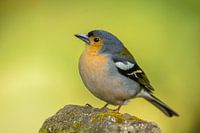 Een portret in warme kleuren van een Madeiravink (Fringilla maderensis) gezeten op een steen in een bos tegen een helder groen gele achtergrond. Dit kleine vogeltje is endemisch op het eiland Madeira in de Atlantische oceaan. De achtergrond van bomen en struiken is totaal vervaagd zodat het zangvogeltje goed naar voren komt.