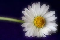 Macrofoto van een madeliefje op een paars/blauwe achtergrond. Gemaakt met softfocuseffect waardoor een dromerig effect ontstaat
